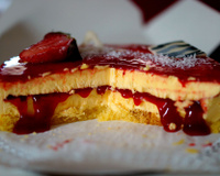 Un cheesecake à déguster frais rehaussé de coulis de fraises.