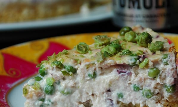 Au moment de servir, concasser le reste de petits pois au wasabi et parsemer le dessus du cheesecake.