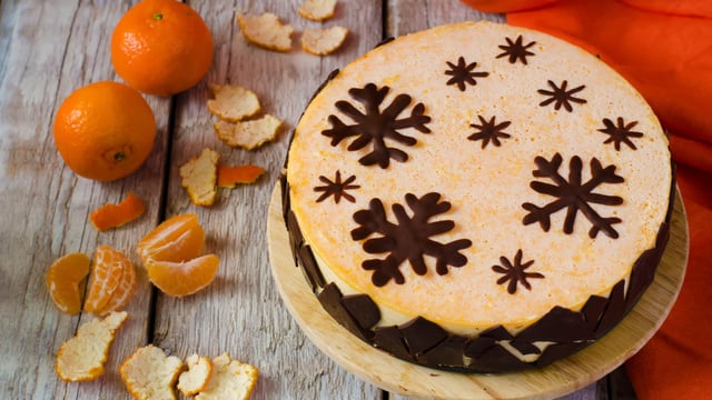Un Cheesecake parfumé aux clémentines et très gourmand avec ses flocons de chocolat noir.