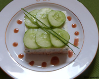Épluchez le restant du concombre puis coupez des rondelles pas trop fines, faites-les dégorger délicatement dans une passoire avec une cuillère à café de sel puis essuyez-les avec un essuie-tout afin de retirer l'excédent d'eau. Placez vos concombre au dessus du cheesecake en rosace ou autre selon la forme de vos emporte-pièces puis remettez au frais jusqu'au moment de servir.