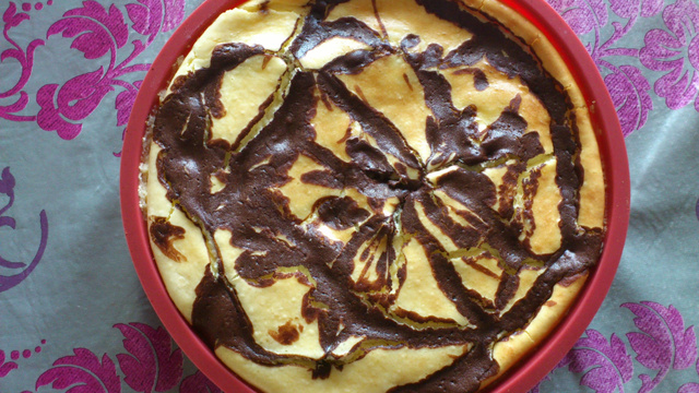 Beurrer un moule, y verser les 3/4 de l'appareil chocolaté, puis le mélange au fromage frais et terminer par le 1/4 chocolaté restant en faisant une spirale à l'aide de la poignée d'une cuillère pour marbrer le gâteau.