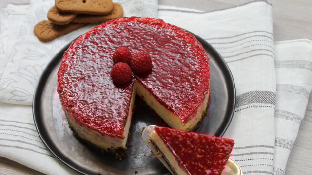 Un gâteau américain parsemé d'un zeste de French touch... Sablé aux spéculoos, crème au cottage cheese adoucie de chocolat blanc et marmelade de framboise maison pour un délice de cheesecake !