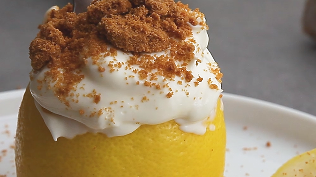 Couper le haut du citron et le dessous, retirer la pulpe et poser sur une assiette. Garnir les citrons avec la préparation au fromage frais.