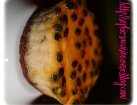 Pendant ce temps, coupez les fruits de la passion en 2 et prélevez la pulpe. Mettre dans une casserole avec 2 cuillères à soupe de sucre, 2 à 3 cuillères à soupe de jus d'orange (en fonction de vos fruits) et 1/2 cuillère à thé d'agar agar.