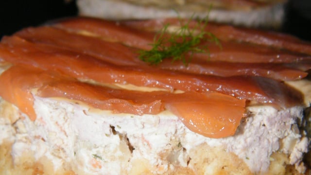 Au moment de servir, démoulez le cheesecake, décorez la surface avec le reste de saumon fumé, accompagnez avec une salade.