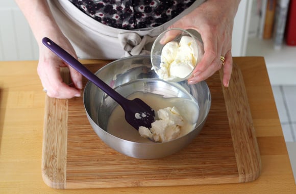 1Faites fondre le chocolat blanc au bain-Marie, lissez, ajoutez la Philadelphia et mélangez.