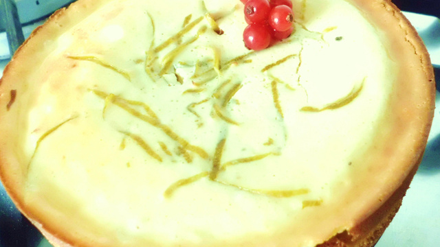 Des zestes de citron vert sur la surface du mélange déposé sur la couche de biscuits, sortie du frigo !