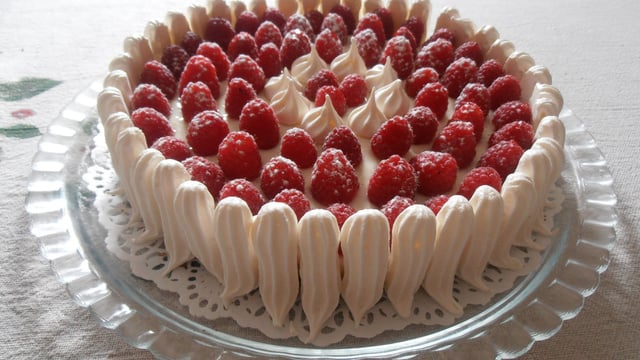 Un sablé reconstitué, un cheesecake au citron vert, des framboises et une coque de petites meringues craquantes.