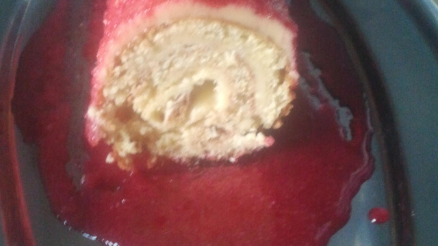 Étaler la crème de framboise au milieu de la pâte et enrouler le biscuit de nouveau.