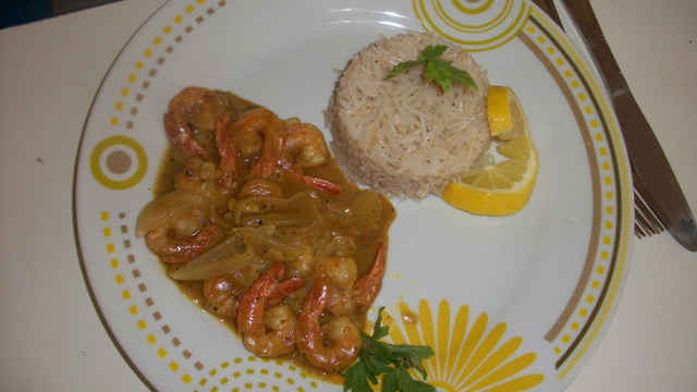 Ajouter les crevettes et faire revenir le tout. Saler, poivrer et ajouter le curry (1 bonne cuillerée à café).