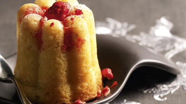 Beurrer des petits moules hauts (darioles, cannelés...), y répartir 1/3 de la pâte. Déposer une praline dans chaque moule, puis recouvrir de pâte ( ¾ du moule ). Enfourner 15 min, puis laisser refroidir avant de démouler. Décorer de sucre glace et de pralines concassées.