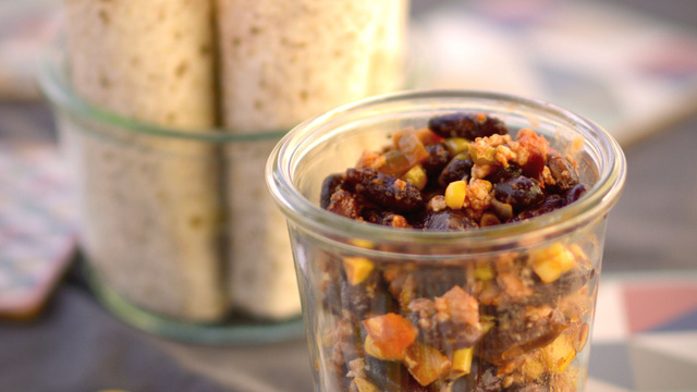 Faites tremper les haricots la veille. Faites-les cuire pendant 25 min à la vapeur. Pendant ce temps précuisez le haché végétal selon les indications sur l’emballage. Épluchez l’oignon et découpez-le en lanières. Découpez et épépinez les poivrons puis faites-les revenir dans un peu d’huile d’olive avec les épices, le sel et le poivre. Rajoutez l’oignon émincé et le haché végétal.