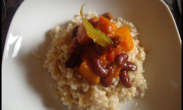Pendant ce temps cuire le riz comme indiquer sur le paquet (45-50 minutes pour le riz complet) si vous avez choisi le riz comme accompagnement. Ajouter les haricots et les épices et laisser encore cuire 15 minutes.