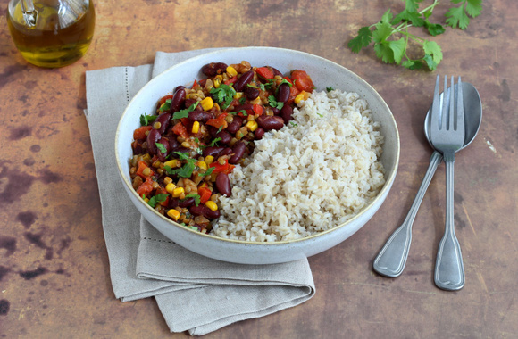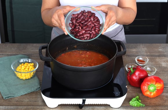 6Ajoutez les haricots rouges, le maïs et le moitié de la coriandre hachée. Laissez mijoter encore 5 minutes.