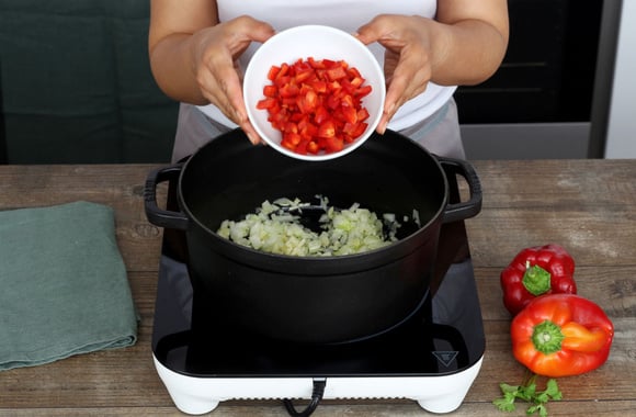 3Versez l'huile d'olive dans une cocotte en fonte et faites-y revenir les oignons, les gousses d'ail et le poivron pendant 5 minutes.