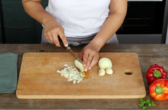 2Hachez finement les oignons et les gousses d'ail. Lavez et essuyez les poivrons. Retirez la calotte du côté du pédoncule, éliminez les graines et les cloisons intérieures sans percer la peau, puis coupez la chair des poivrons en dés.