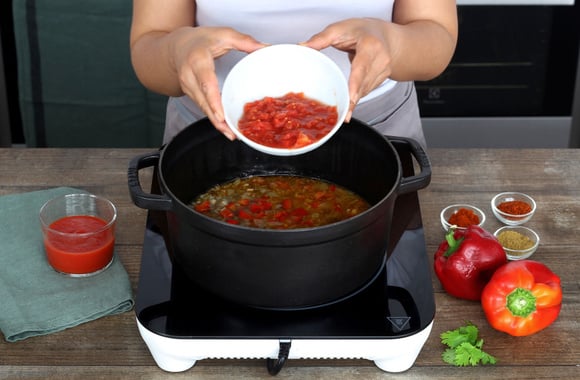 5Ajoutez les tomates pelées et concassées, le coulis de tomates, le chili, le cumin et le paprika. Laissez mijoter 8 minutes.