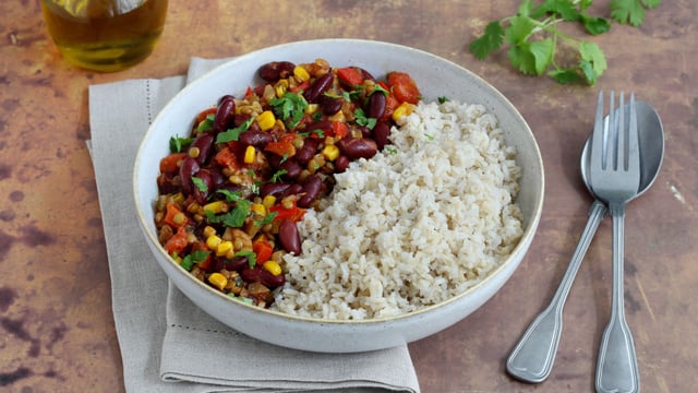 1Dans une casserole d'eau salée, versez le riz complet et laissez-le cuire pendant 30 minutes. Puis égouttez-le et réservez-le.