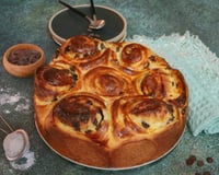 Une fois la pâte levée, la dégazer et l'étaler sur un plan de travail, la tartiner de confiture de myrtille.Enrouler la pâte en boudin ensuite couper des tronçons et les placer dans un moule préalablement beurré et fariné.