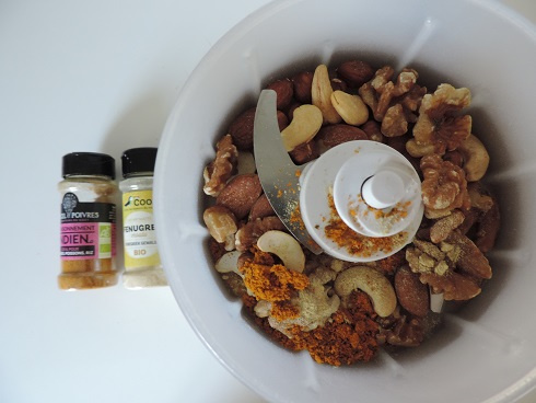 1Laver les feuilles et enlever la nervure centrale (à utiliser pour une soupe par exemple!). Couper les feuilles en dimension choisies et bien les sécher. Réserver. Mixer les noix avec le fenugrec et le mélange indien.