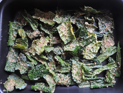NB: Vous pouvez remplacer le chou palmier par du chou kale, le mélange de noix par des noix de votre choix, le mélange d'épices indiennes par du sel et du poivre, le fénugrec par de l'ail...... J'ai commencé par placer mes feuilles dans un plat mais je pense que la meilleure solution, c'est de les placer directement sur un papier sulfurisé qui permettra une cuisson plus homogène et rapide. L'assaisonnement indien contient du sel,oignon,curcuma,ail,gingembre,coriandre,carvi,piment doux, persil,cumin, sauge, poivres, arôme naturel.