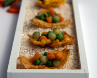 - 5DressageDisposer une cuillère de risotto de légumes dans chaque chips et servir idéalement en apéritif ou encore en accompagnement.