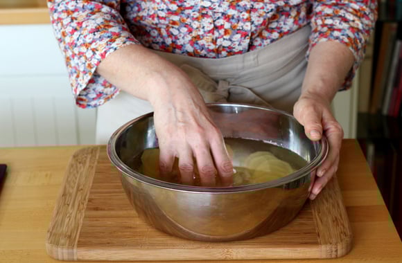 2Remplissez le bol d'eau froide et brassez les rondelles de pommes de terre, tout en faisant couler l'eau. C'est prêt quand l'eau qui sort du bol est bien claire.