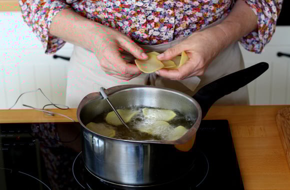 6Prélevez une grosse poignée de rondelles de pommes de terre dans le four puis plongez-les dans le bain de friture. Faites-les cuire pendant 3 à 4 minutes en les brassant de temps à temps à l'aide d'une écumoire. Les chips sont cuites lorsqu'elles sont dorées.