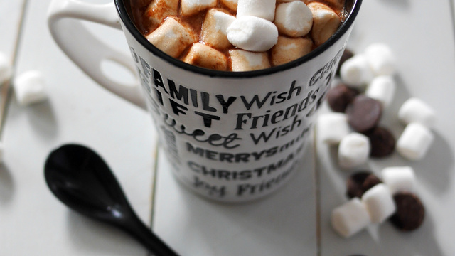 Versez le chocolat chaud dans le mug et recouvrez de mini chamallows.