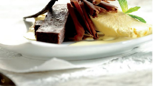 Mélangez bien. Versez le mélange dans un récipient plat en porcelaine beurré. Couvrez d'un film alimentaire non perforé et résistant à la chaleur. Faites cuire pendant 24 minutes à 100°C. Divisez en 6 portions, et servez avec de la crème glacée. Décorez avec un physalis.
