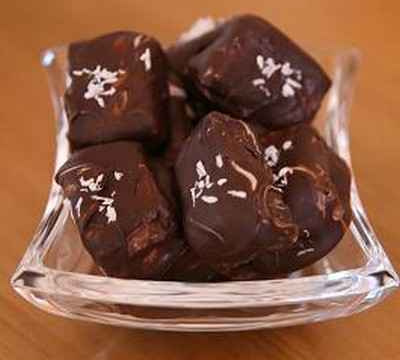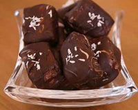 4. Faire fondre le chocolat noir au bain-marie. Prendre chaque morceaux de praliné et recouvrir rapidement de chocolat fondu (il faut aller assez vite car le chocolat chaud fait fondre le praliné). Placer les chocolats sur une plaque recouverte de papier sulfurisé et placer quelques copeaux de noix de coco râpée sur le dessus pour décorer.