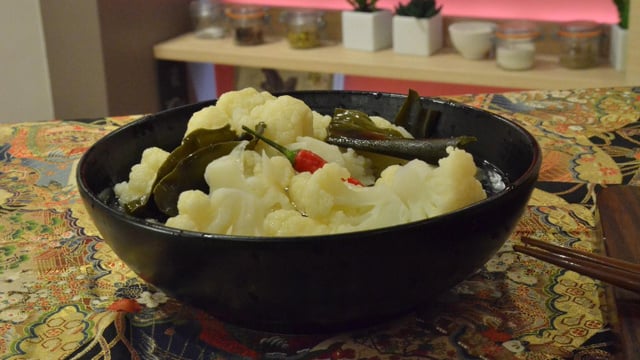 Dans un saladier mettre le chou-fleur, les piments, le kombu et le vinaigre sucré. Laisser reposer le tout au moins 12h.