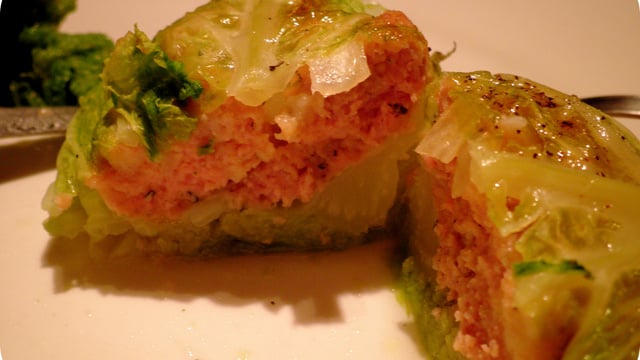 Prendre les feuilles une à une et déposer au centre une cuillère à soupe de farce. Envelopper la farce avec la feuille. Poivrer le tout.
