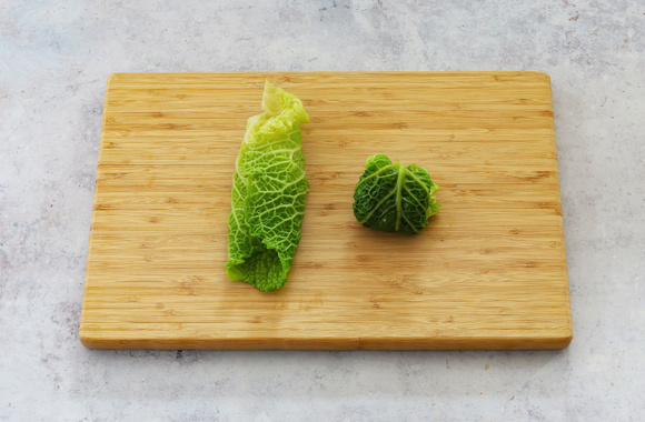 4Mettez les feuilles de chou à plat sur le plan de travail. A l'aide d'un couteau, retirez 2 à 3 cm de trognon de chaque feuille, sans les casser.