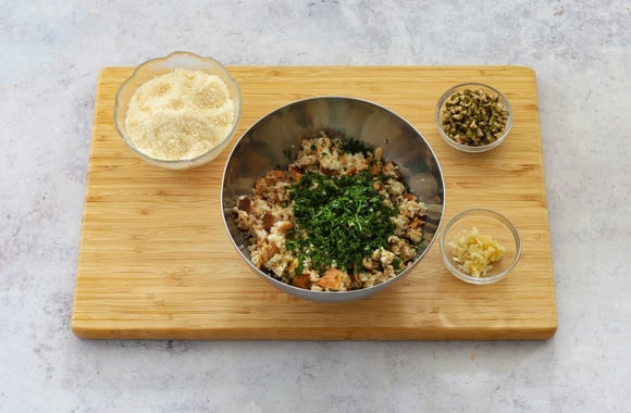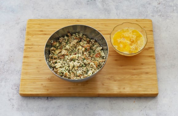 Égouttez le pain, pressez-le entre vos mains pour enlever un maximum d'eau, puis émiettez-le dans un saladier. Salez, poivrez, ajoutez la noix muscade. Ajoutez le parmesan râpé, le persil haché et les morceaux de câpres. Mélangez.