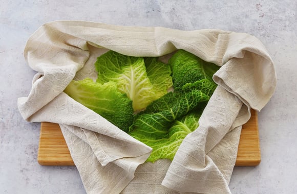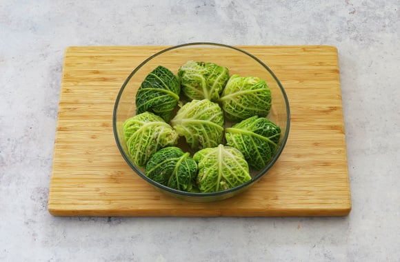 Egouttez-les, plongez-les dans un saladier rempli d'eau froide pour garder leur couleur verte. Laissez refroidir, égouttez et séchez bien les feuilles de chou avec un linge propre, en faisant attention à ne pas les abimer.