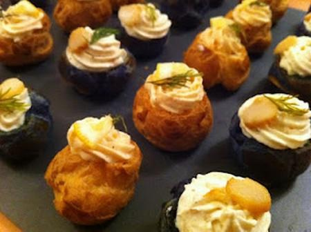 Battre la crème en chantilly au batteur, diviser la préparation en deux. Dans une moitié, ajoutez le saumon fumé mixé, dans l'autre moitié faire cuire les noix de pétoncle,les mixer puis les ajouter à la crème. Garnir les choux à l'aide d'une poche à douille avec douille cannelée. décorer de brins d'aneth et de morceaux de citron pour les choux saumon, et de brins d'aneth et de morceaux de pétoncle pour les mousses de pétoncle.