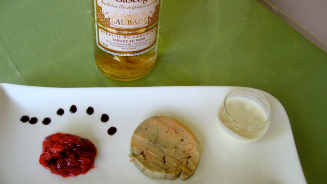 Une tranche de foie gras servie avec un chutney de fraise cuisiné au floc de Gascogne et une verrine de crème d'ail.