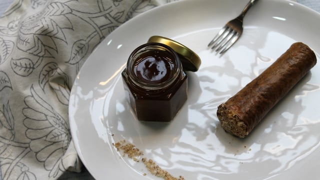 Mettre la préparation dans une poche à douille, puis garnir chaque cigare de la préparation. Tremper le bout de chaque dans la poudre de noisette, pour rappeler le cigare et servir avec un chutney (oignon ou figue).