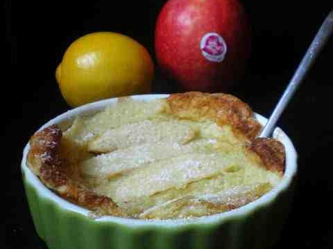 Poser les morceaux de pommes dans des moules individuels. Verser la crème aux œufs et enfourner pendant 30 min. Laisser tiédir puis saupoudrer de sucre glace à l'aide d'une petite passoire.