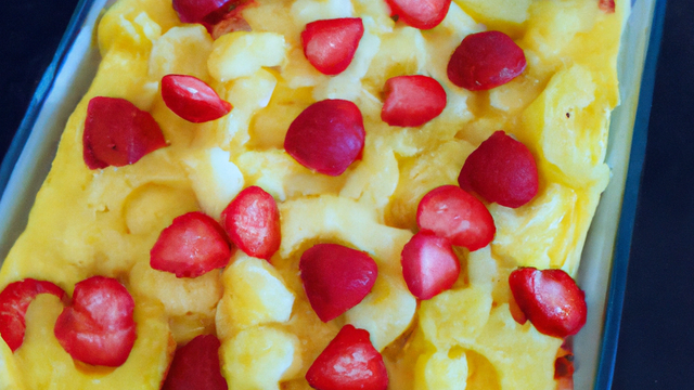 Disposez les rondelles d'ananas dans le plat (répartissez à peu près, il est possible de mettre plusieurs couches) et ajouter les fraises coupées en 2 (quantité suivant votre goût).