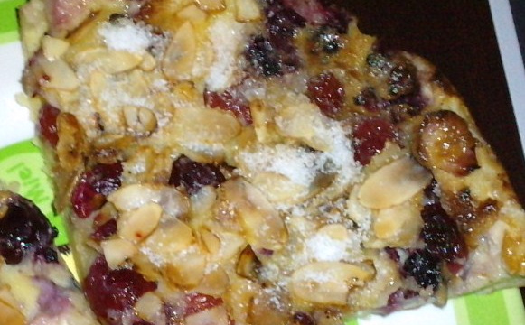 C'est un clafoutis sucré aux fruits rouges, cerises bigarreau et son subtile parfum de liqueur de banane, agrémenté d'amande caramélisées... humm un délice pour les papilles !