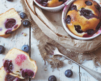 Verse un fond de préparation dans un petit ramequin, recouvir d'une bonne poignée de myrtilles puis d'une autre couche de préparation et mélanger délicatement les myrtilles avec la pâte.