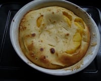 Déposer joliment les tranches de pêche au fond du moule puis verser l'appareil à clafoutis dessus.