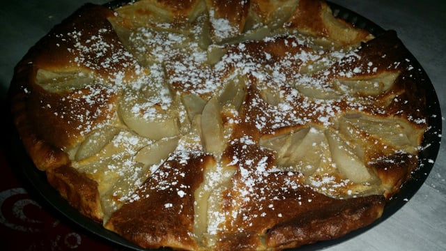 Poires, pistaches, kirsch, lait, vanille, crème épaisse, oeufs, sucre roux, farine, sel