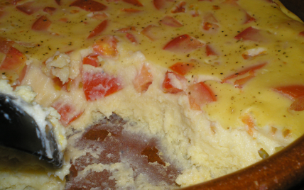 Dans un saladier, fouettez les oeufs. Versez le mélange lait-farine sur les oeufs en fouettant. Ajoutez ensuite la ricotta, l'ail, les tomates coupées en petits cubes, le basilic, et les olives coupées en rondelles. - 2