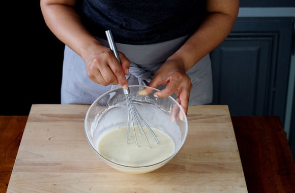 6Mélangez l'ensemble à l'aide d'un fouet jusqu'à obtenir une préparation bien homogène de la même consistance qu'une pâte à crêpe.
