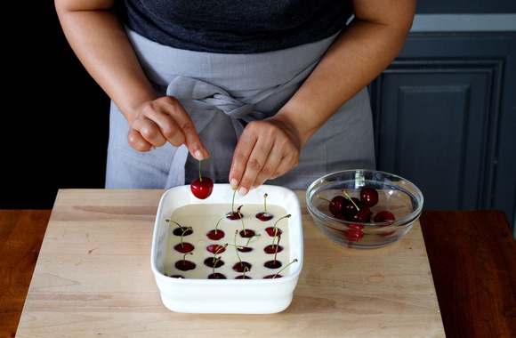 8Déposez les cerises lavées en conservant leurs queues et leurs noyaux. Garnissez bien le plat de cerises.