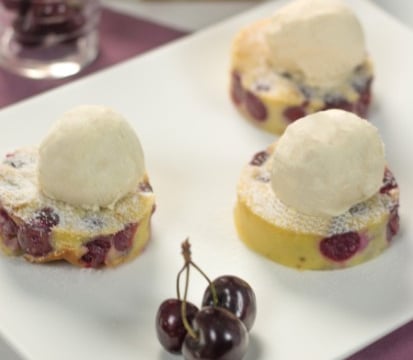 Un clafoutis moelleux aux cerises, nappé d"une boule de Crème Glacée Crème de Vanille Carte d"Or® !