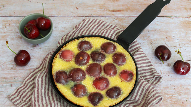 Un clafoutis léger aux cerises que l'on cuit à la poêle, sans besoin de four. Il est équilibré du point de vue nutritionnel et idéal pour une alimentation saine. Il est aussi sans gluten.